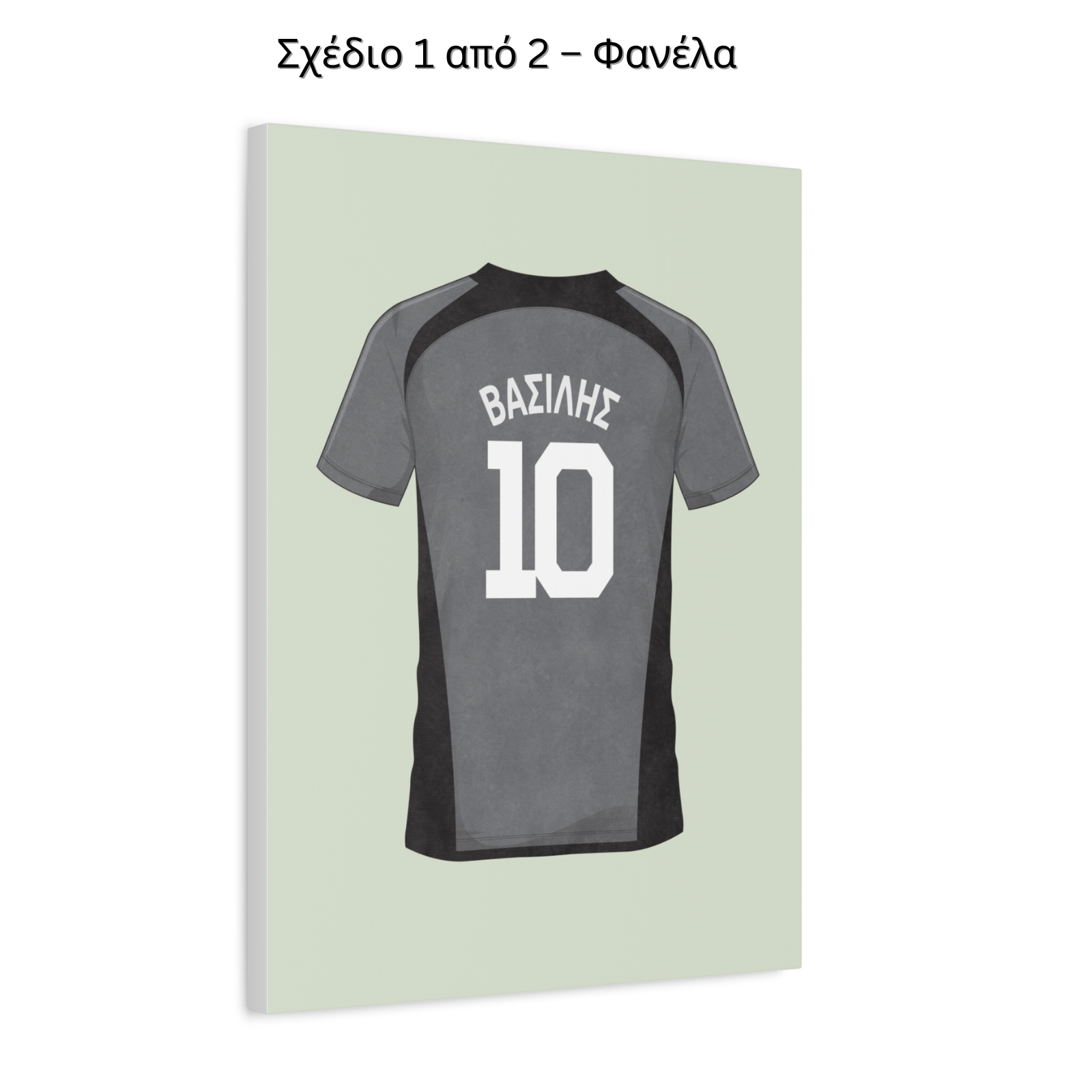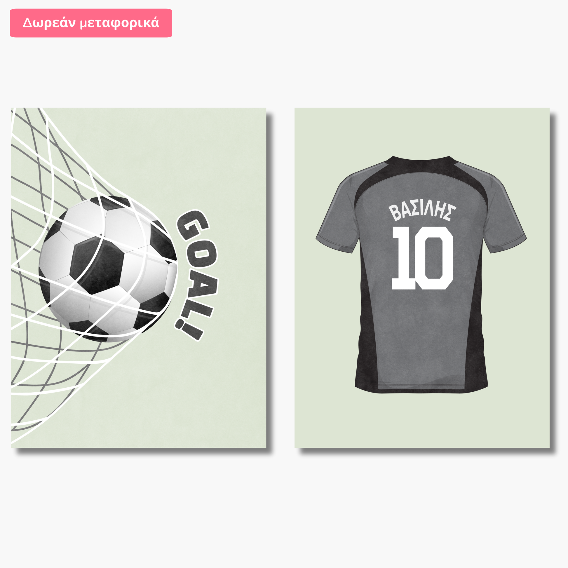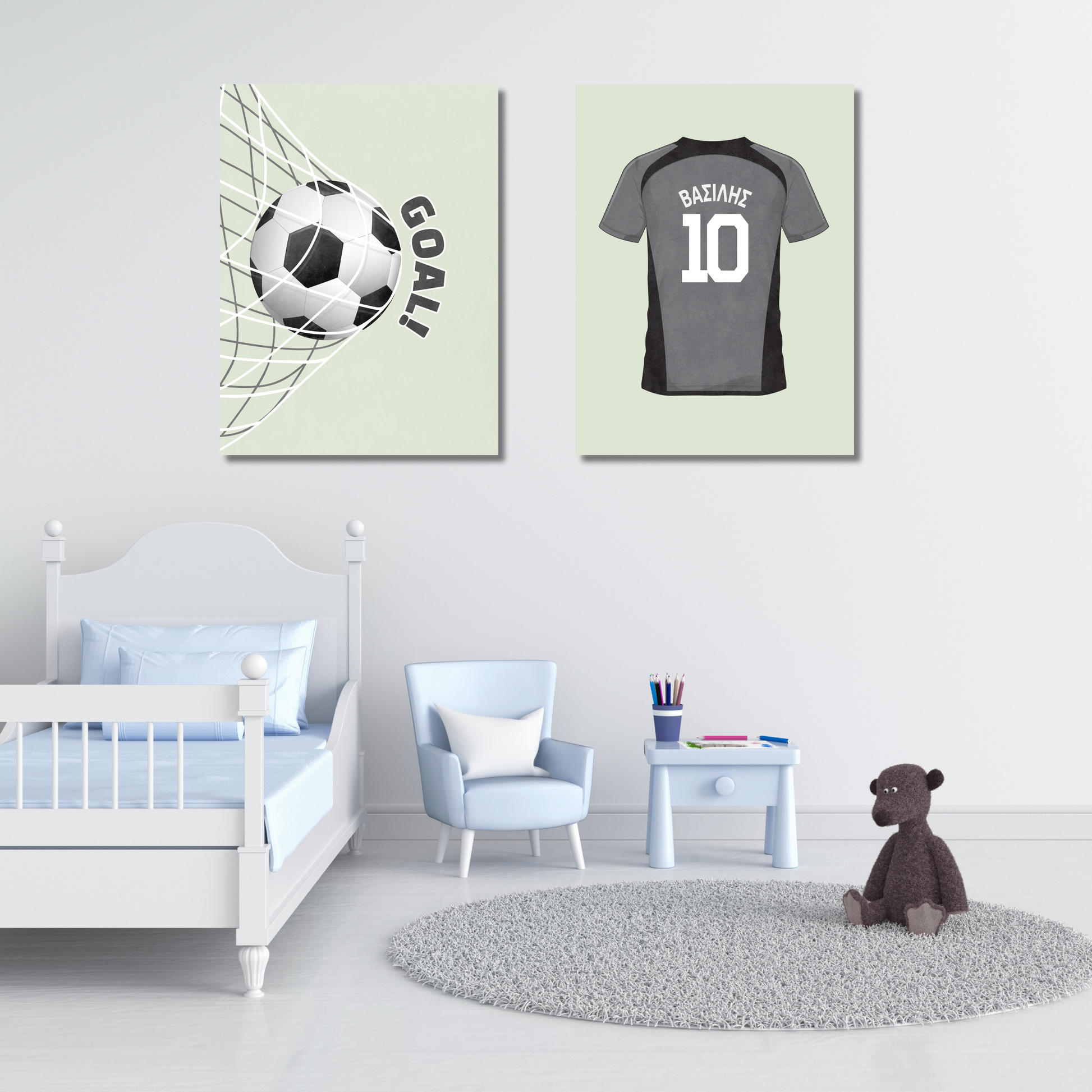 ⚽ Το σετ περιλαμβάνει δύο εντυπωσιακά σχέδια: μία φανέλα ποδοσφαίρου με το όνομα και τον αριθμό της επιλογής σας, και μία δυναμική σκηνή γκολ! Ιδανικό για τους μικρούς μας ποδοσφαιριστές, προσθέτει στυλ και προσωπικότητα στο παιδικό δωμάτιο. Μπορείτε να επιλέξετε το χρώμα της φανέλας (γκρι, κόκκινο, πράσινο, μαύρο ή κίτρινο), καθώς και το νούμερο και το όνομα που θα εμφανίζονται. Διατίθεται ως αφίσα ή καμβάς, σε διάφορες διαστάσεις για να προσαρμόζεται τέλεια στον χώρο σας. Ένα προσωποποιημένο δώρο που θα αγαπήσουν!