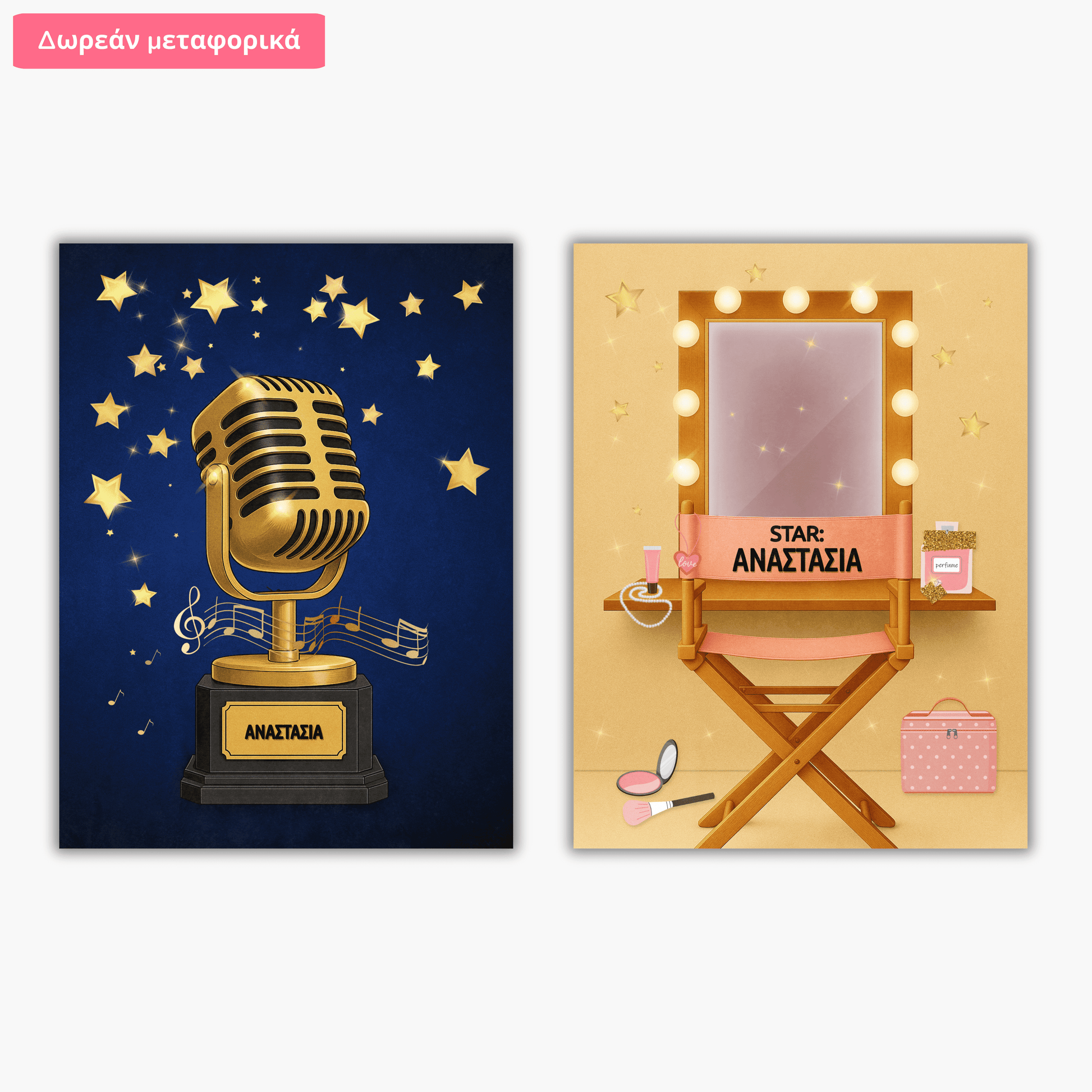 Ανακαλύψτε ένα ξεχωριστό σετ δύο προσωποποιημένων σχεδίων που θα γεμίσει το παιδικό δωμάτιο με χρώμα και φαντασία! Το σετ περιλαμβάνει δύο διαφορετικά σχέδια – ένα με θέμα το μικρόφωνο και τη μουσική, και ένα δεύτερο με θέμα το καμαρίνι και τα φώτα της σκηνής. Κάθε σχέδιο εκτυπώνεται ξεχωριστά και περιλαμβάνει το όνομα του παιδιού, προσθέτοντας μια μοναδική, προσωπική πινελιά. Είναι ιδανικό για παιδιά που αγαπούν την έκφραση και τα καλλιτεχνικά θέματα.Διάλεξε αφίσα η καμβά!